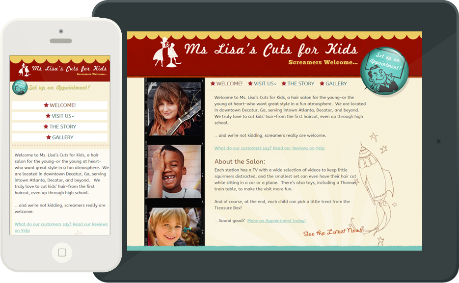 Ms. Lisa’s Cuts for Kids is a salon specializing in children’s hair cuts in downtown Decatur, GA. The salon’s website highlights its unique style and appeals to kids–and parents–of all ages. We first designed and launch this site in 2011, and since then we’ve updated it to adapt to the changing needs of the salon, and to make it more mobile friendly. The website design features custom illustration as well. The branding developed through the design of the site inspired much of the look and feel of the salon itself.