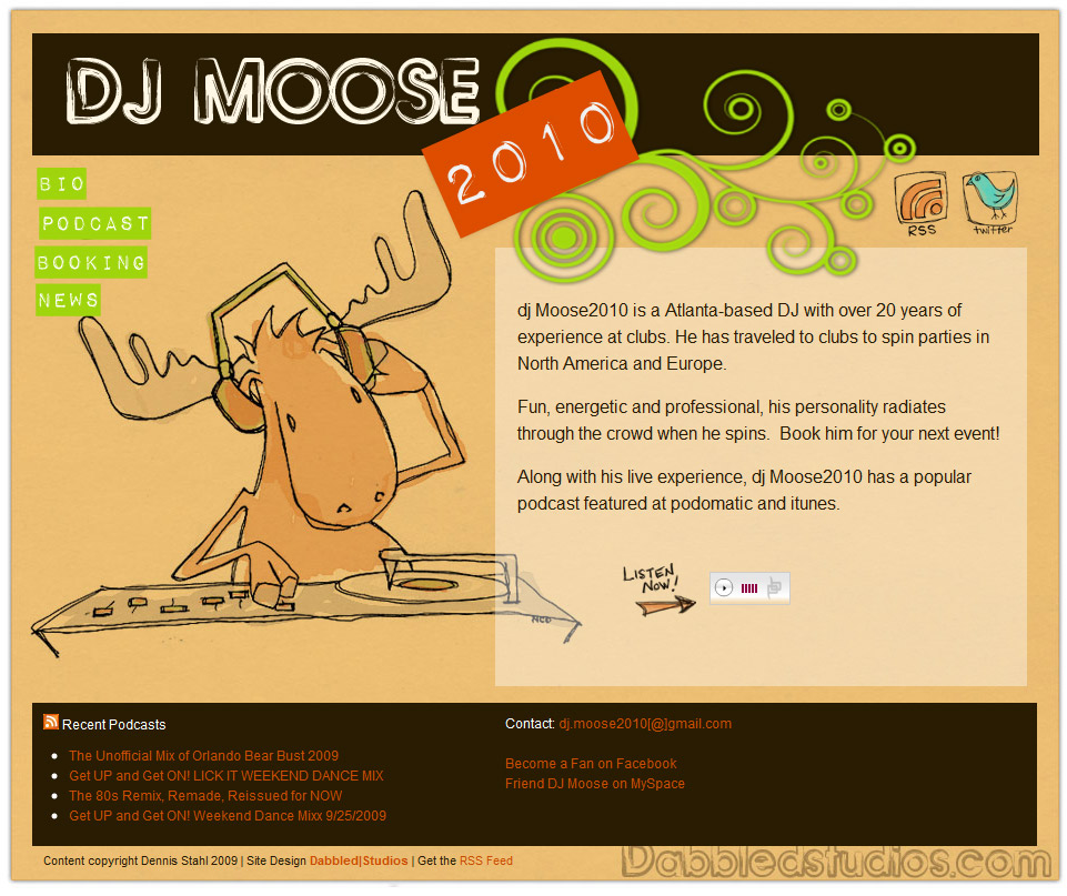The site for Dabbled|Studios’ latest, and most musical client, DJ Moose 2010, is live today… The custom illustration of a DJ-ing moose and hand-drawn elements give a hip look & feel–while still easy to read and professional. It takes advantage of the current RSS feed for his podcast to keep the site up to date and fresh — and it will play music on request!