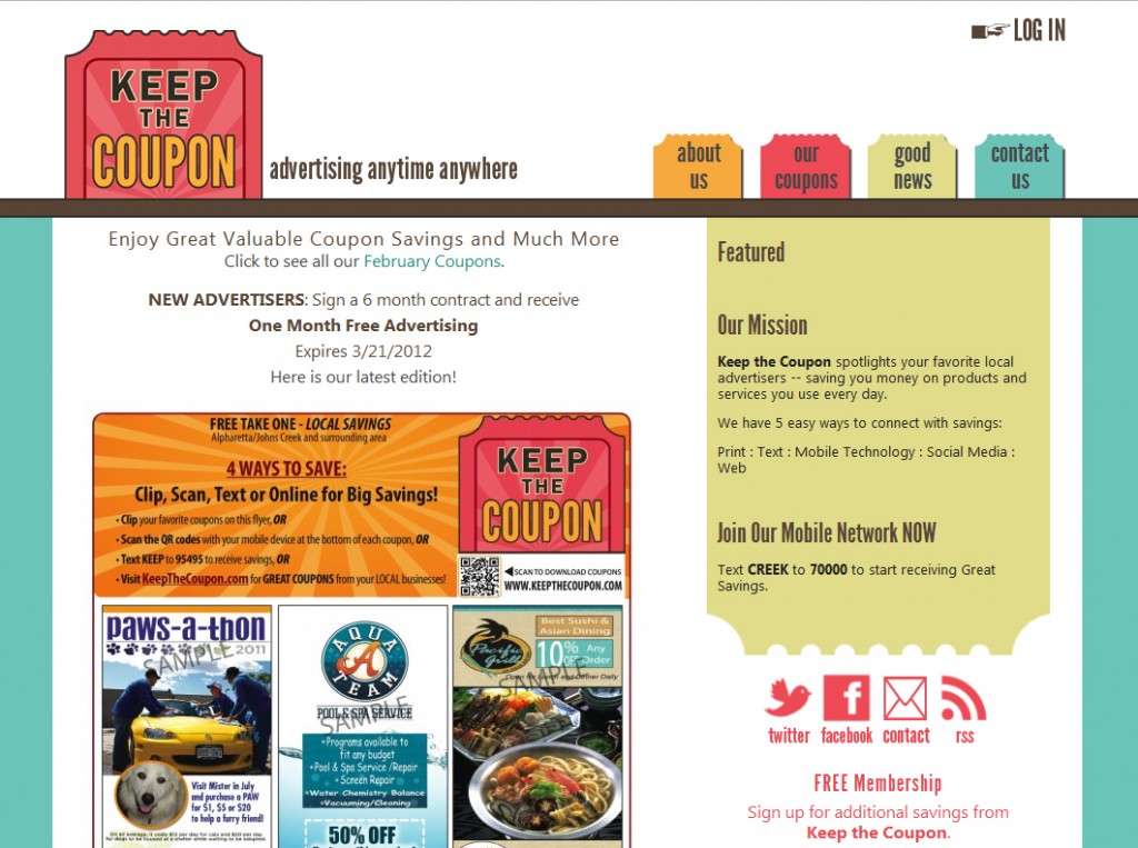 Keep The Coupon Keep the Coupon is a new coupon site, featuring QR coded coupons. Features of the site include a protected area for advertisers, coupon submit and approval processes, coupon activation based on date, find coupons on a map, and others.